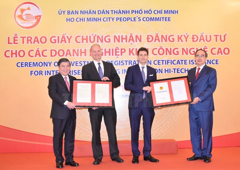 胡志明市委書記阮善仁先生與城市人民委員會主席阮成峰先生給FDI投資商頒發投資證書。