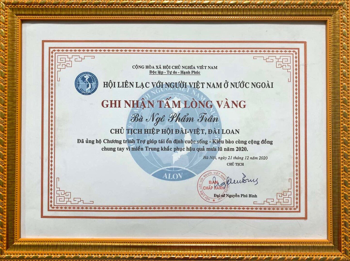 西元2020年12月1日,吳品蓁理事長捐贈越南中越水災受難者