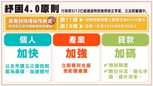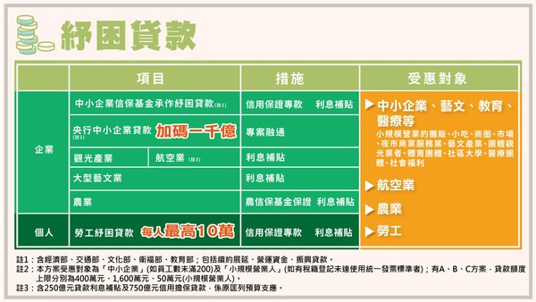 除了預算部分,還有非預算協助的貸款部分。經濟部的相關措施,如紓困貸款、延長貸款、利息補貼等,會持續做到年底。特別針對央行對中小企業的貸款部分,去年總共額度是3000億,現在再加碼1000億,總共是4000億額度。