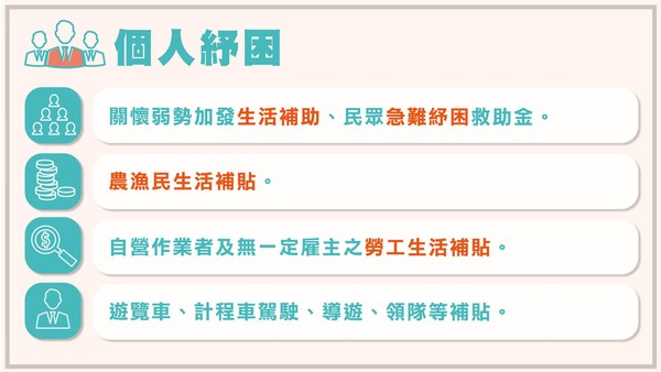 農漁民的部分是1萬元紓困金,若是甲級漁工有參與職業工會,就跟職業工會是一樣,每個月1萬、3個月總共3萬。另外,包括交通部轄下的導遊、領隊、計程車、遊覽車司機,每個月1萬、3個月總共3萬。