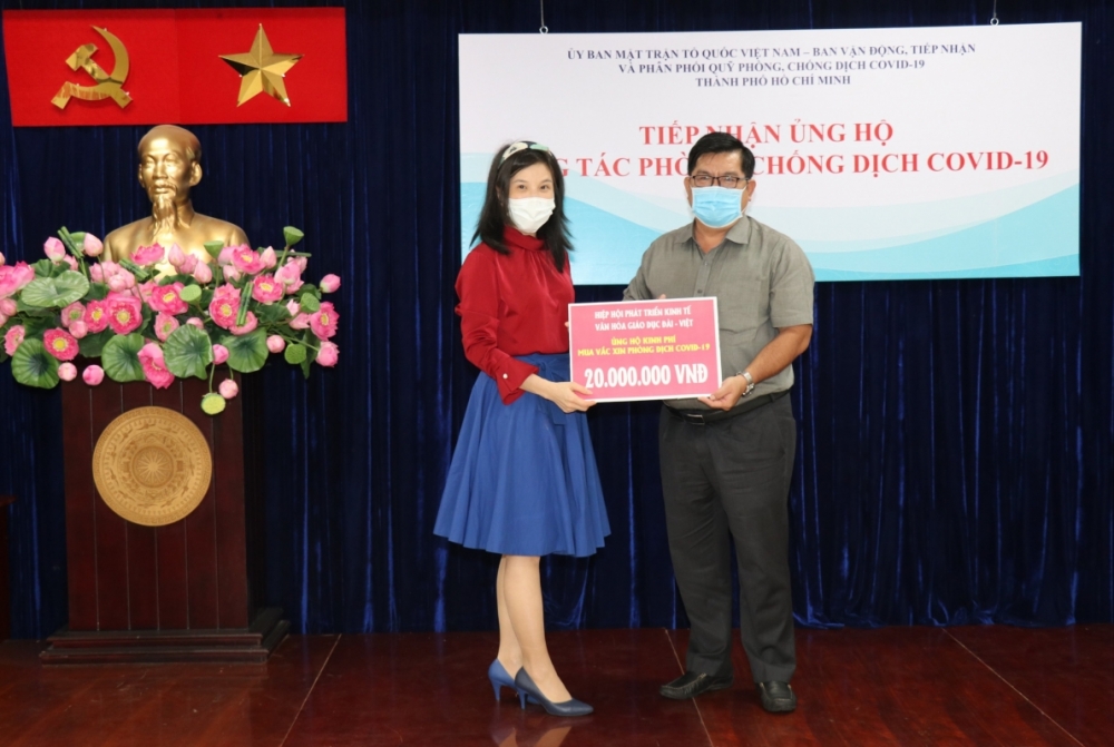 在捐款接納儀式上,台越協會理事長吳品蓁女士為胡志明市新冠疫苗基金會捐贈2千萬越盾。